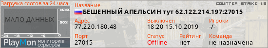 БЕШЕННЫЙ АПЕЛЬСИН тут 62.122.214.197:27015 представлен в виде сервера кс 1.6. Из всех имеющихся на сайте модификаций игровых серверов, вам может понравиться Surf серверы cs. А для быстрой навигации по всем меткам - используйте главную страницу игры Counter Strike 1.6.