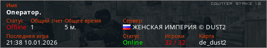 Играет на Counter Strike 1.6 сервере. Страна: РоссияПервый раз замечен 21:36 10.01.2026