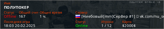 Играет на Counter Strike 1.6 сервере. Страна: РоссияПервый раз замечен 17:32 01.02.2025