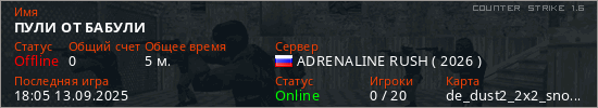 Играет на Counter Strike 1.6 сервере. Страна: РоссияПервый раз замечен 18:01 13.09.2025