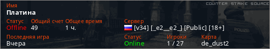 Играет на Counter Strike Source сервере. Страна: РоссияПервый раз замечен 18:58 22.09.2025