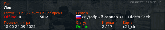 Играет на Counter Strike 1.6 сервере. Страна: РоссияПервый раз замечен 23:38 24.08.2025
