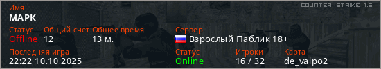 Играет на Counter Strike 1.6 сервере. Страна: РоссияПервый раз замечен 23:18 15.12.2024