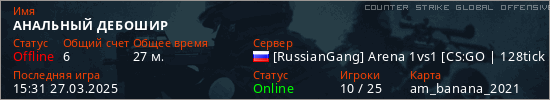 Играет на Counter Strike Global Offensive сервере. Страна: РоссияПервый раз замечен 15:05 27.03.2025