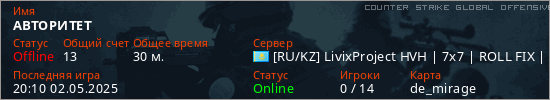 Играет на Counter Strike Global Offensive сервере. Страна: КазахстанПервый раз замечен 17:18 21.02.2025
