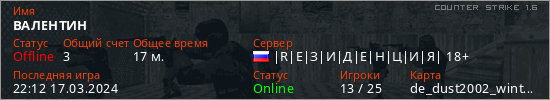 Играет на Counter Strike 1.6 сервере. Страна: РоссияПервый раз замечен 23:32 05.03.2024