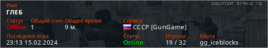 Играет на Counter Strike 1.6 сервере. Страна: РоссияПервый раз замечен 16:49 04.06.2023