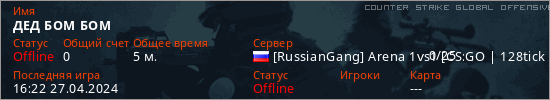 Играет на Counter Strike Global Offensive сервере. Страна: РоссияПервый раз замечен 15:25 27.04.2024