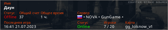 Играет на Counter Strike Source сервере. Страна: РоссияПервый раз замечен 19:14 29.12.2022