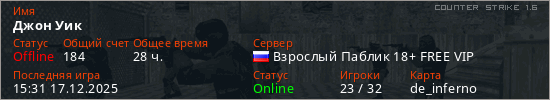 Играет на Counter Strike 1.6 сервере. Страна: РоссияПервый раз замечен 19:50 17.07.2020