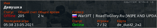 Играет на Counter Strike 1.6 сервере. Страна: РоссияПервый раз замечен 02:52 23.05.2021