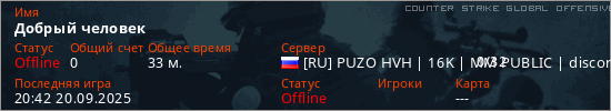Играет на Counter Strike Global Offensive сервере. Страна: РоссияПервый раз замечен 18:59 20.09.2025