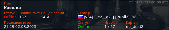 Играет на Counter Strike Source сервере. Страна: РоссияПервый раз замечен 11:41 01.12.2023