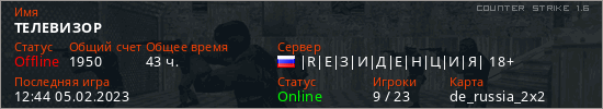 Играет на Counter Strike 1.6 сервере. Страна: РоссияПервый раз замечен 01:34 11.05.2022