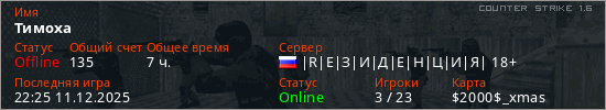 Играет на Counter Strike 1.6 сервере. Страна: РоссияПервый раз замечен 23:18 24.03.2024