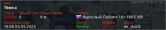 Играет на Counter Strike 1.6 сервере. Страна: РоссияПервый раз замечен 20:34 01.05.2025