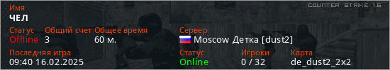 Последний раз был в сети 09:40 16.02.2025 Игрок с таким ником замечен на 18 серверах