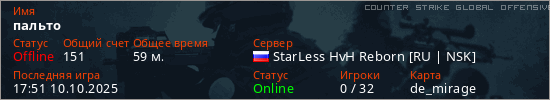 Играет на Counter Strike Global Offensive сервере. Страна: РоссияПервый раз замечен 13:15 03.10.2025