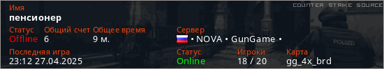 Играет на Counter Strike Source сервере. Страна: РоссияПервый раз замечен 00:41 09.07.2023