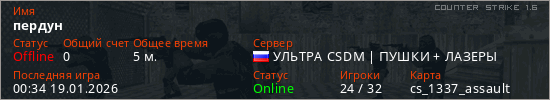 Играет на Counter Strike 1.6 сервере. Страна: РоссияПервый раз замечен 00:28 19.01.2026