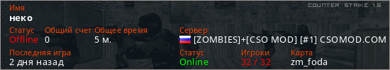 Играет на Counter Strike 1.6 сервере. Страна: РоссияПервый раз замечен 05:10 01.02.2026