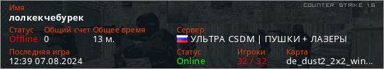 Играет на Counter Strike 1.6 сервере. Страна: РоссияПервый раз замечен 18:32 28.06.2024