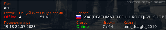 Играет на Counter Strike Source сервере. Страна: РоссияПервый раз замечен 15:31 20.07.2023
