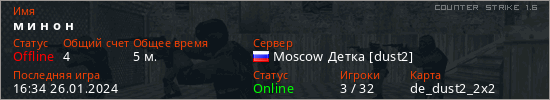 Играет на Counter Strike 1.6 сервере. Страна: РоссияПервый раз замечен 15:47 26.01.2024