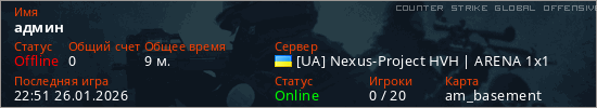 Играет на Counter Strike Global Offensive сервере. Страна: УкраинаПервый раз замечен 22:05 26.01.2026