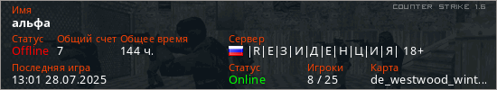 Играет на Counter Strike 1.6 сервере. Страна: РоссияПервый раз замечен 23:42 24.03.2025