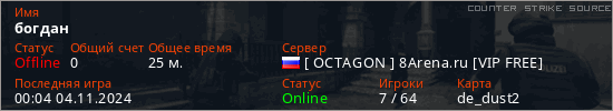 Играет на Counter Strike Source сервере. Страна: РоссияПервый раз замечен 16:52 27.05.2024