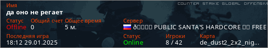 Играет на Counter Strike Global Offensive сервере. Страна: РоссияПервый раз замечен 18:08 29.01.2025