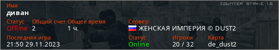 Последний раз был в сети 21:50 29.11.2023 Игрок с таким ником замечен на 8 серверах