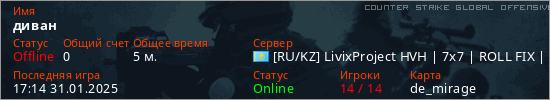 Играет на Counter Strike Global Offensive сервере. Страна: КазахстанПервый раз замечен 16:51 31.01.2025