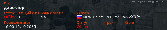 Играет на Counter Strike 1.6 сервере. Страна: РоссияПервый раз замечен 15:58 15.10.2025