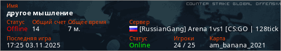 Играет на Counter Strike Global Offensive сервере. Страна: РоссияПервый раз замечен 16:57 03.11.2025