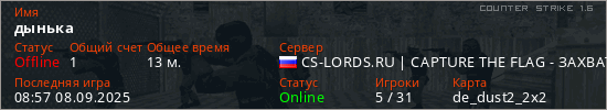 Играет на Counter Strike 1.6 сервере. Страна: РоссияПервый раз замечен 15:31 06.09.2025