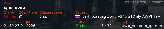 Играет на Counter Strike Source сервере. Страна: РоссияПервый раз замечен 21:37 27.01.2026