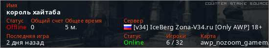 Играет на Counter Strike Source сервере. Страна: РоссияПервый раз замечен 23:08 31.12.2025