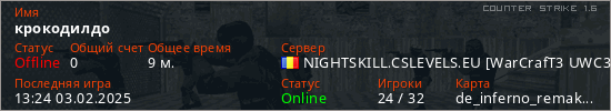 Последний раз был в сети 13:24 03.02.2025 Игрок с таким ником замечен на 12 серверах