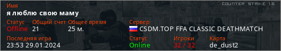 Играет на Counter Strike 1.6 сервере. Страна: РоссияПервый раз замечен 00:27 27.01.2024