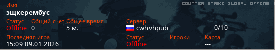 Играет на Counter Strike Global Offensive сервере. Страна: РоссияПервый раз замечен 14:52 09.01.2026