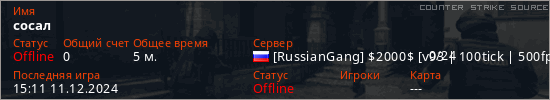 Играет на Counter Strike Source сервере. Страна: РоссияПервый раз замечен 15:06 11.12.2024