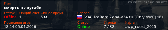 Играет на Counter Strike Source сервере. Страна: РоссияПервый раз замечен 18:15 05.01.2026
