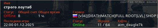 Играет на Counter Strike Source сервере. Страна: РоссияПервый раз замечен 14:28 08.10.2025