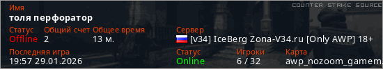 Играет на Counter Strike Source сервере. Страна: РоссияПервый раз замечен 18:55 20.01.2026