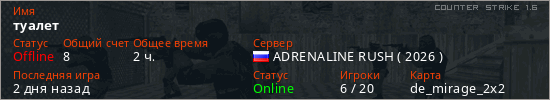 Играет на Counter Strike 1.6 сервере. Страна: РоссияПервый раз замечен 16:52 03.02.2026