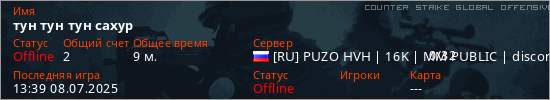 Играет на Counter Strike Global Offensive сервере. Страна: РоссияПервый раз замечен 22:12 07.07.2025