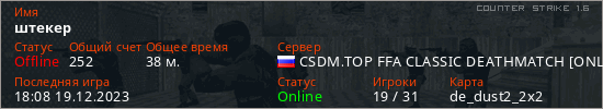 Играет на Counter Strike 1.6 сервере. Страна: РоссияПервый раз замечен 23:13 15.12.2023