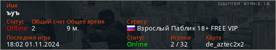 Играет на Counter Strike 1.6 сервере. Страна: РоссияПервый раз замечен 16:26 26.11.2023